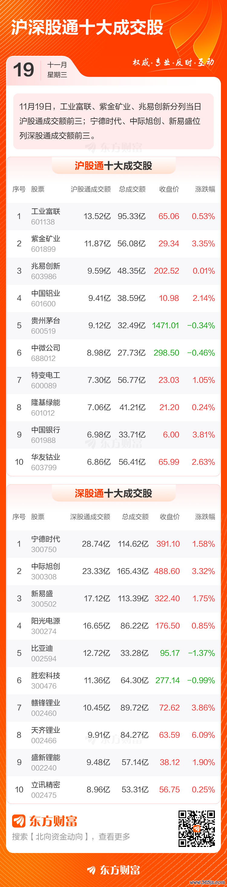 工业富联、紫金矿业、兆易创新位列沪股通成交前三,成交额分别为13.52亿、11.87亿、9.59亿;宁德时代、中际旭创、新易盛位列深股通成交前三,成交额分别为28.74亿、23.33亿、17.12亿。